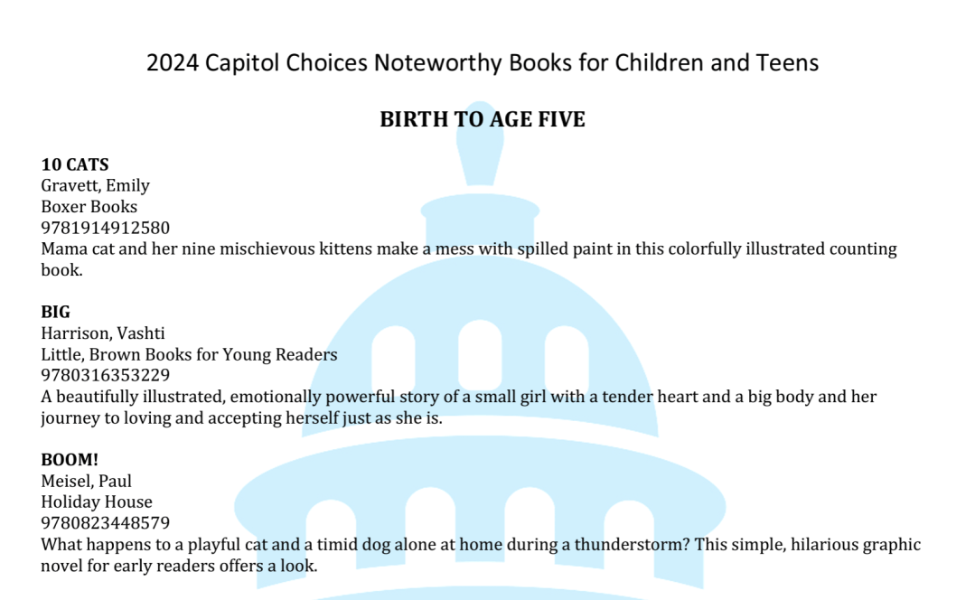 The 2024 Capitol Choices list is now available for download. We appreciate all the work our members put in to reading and sharing books this year as we resumed in-person ballot meetings and worked to grow our membership diversely. Congratulations to all of the authors, illustrators, and publishing teams behind the 100 new and noteworthy titles published between October 2023 and December 2024.